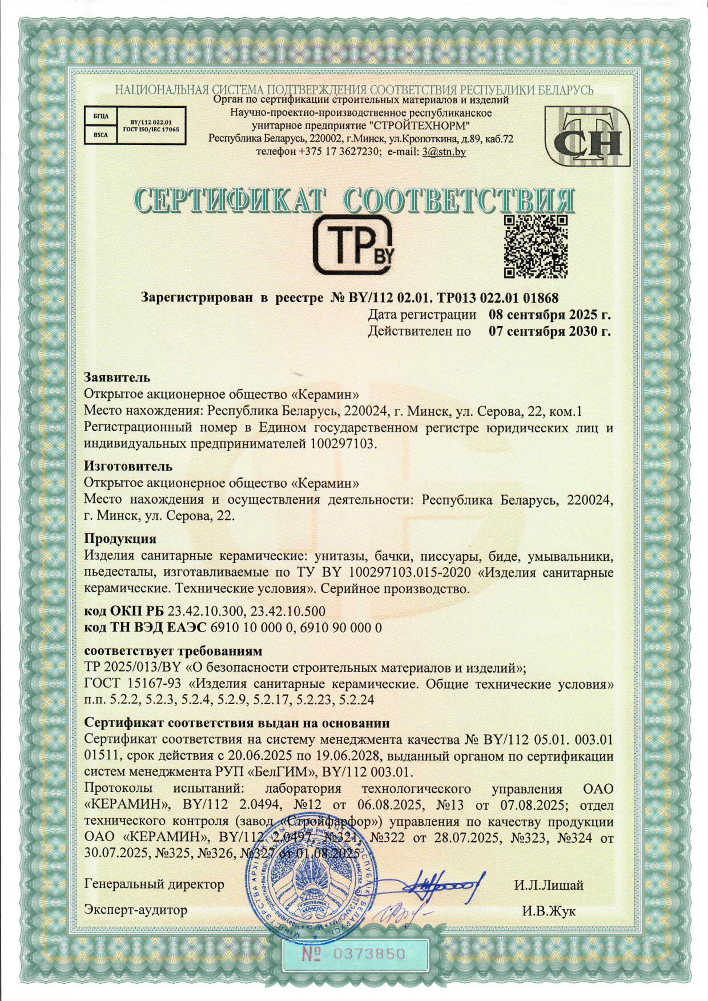 Вся продукция, выпускаемая ОАО "Керамин", сертифицирована на соответствие требованиям государственных и международных стандартов, что позволяет продвигать ее не только на рынке России и стран СНГ, но и в странах Евросоюза. В данном разделе представлены действующие сертификаты соответствия.